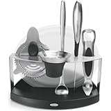 The OXO Steel 7-piece Barware Set is the perfect balance of function and elegance. A Cocktail Strainer, Cocktail Mixing Spoon, Jigger, Bar Cutting Board, Citrus Knife and Bottle Opener are the essential tools for all barware tasks. Each of these tools has its own distinct storage space in the sleek stainless steel Bar Stand. Cocktail Strainer has raised lip to prevent liquids from dripping Mixing Spoon has non-slip handle Jigger has soft grip and measurement markings Dual function Bottle opener for bottles and cans Dishwasher safe