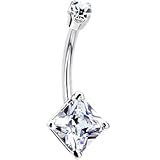 14K White Gold Cubic Zirconia Princess Belly Ring. Solid gold princess solitaire belly ring designed with a 3mm top cubic zirconia and a brilliant 6mm bottom cubic zirconia. Cubic zirconia gold gold navel ring. Princess cubic zirconia belly ring. Solid gold internally threaded belly ring. High quality handmade body jewelery and piercing jewelry in solid gold. Specifcations: Solid 14K Gold, Internally Threaded, 3mm and 6mm Cubic Zirconia, Prong-Set, Handmade in the USA, Hand Polished