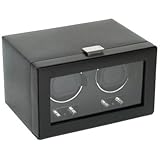 Double Watch Winder with Cover. The Wolf Designs Heritage Module 2.1 Collection will keep fine timepiece collections of all sizes ticking. Each winder is encased in faux leather with a glass front cover plus chrome clasp closures and control knobs. The Double Watch Winder with Cover maintains and displays two fine timepieces. Note: If your watches do not wind themselves via wrist motion, they cannot be wound by this winder. Features Include: Patented Rotation Program: Intermittent rotation with pause and sleep phases pre-programmed. Rotation Settings: Pre-programmed at 900 turns per day. Directional Settings: Clockwise, Counter-Clockwise and Bi-Directional. Start Delay Option: 10 seconds or 12 hours. Lock-in watch cuff accommodates larger, heavier watches. Operates on included 3.3 volt AC/DC power adapter or D-Cell batteries (alkaline or lithium). Dimensions: 10.25" L x 7.5" W x 6.125" H; 8 lbs. Black faux leather exterior, chrome clasp closure and control turn knobs with tempered glass cover Patented rotation program: intermittent rotation with pause and sleep phases pre-programmed Newly designed watch cuff to fit larger, heavier watches Operates on 3.3V adapter (included) or D-Cell alkaline or lithium batteries. Dimensions: 10.25"w x 7.50"d x 6.125"h